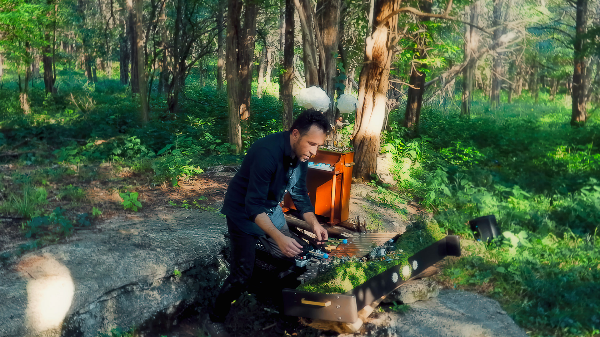 The sound coming through the 5 microphones is processed by guitar pedals, adding organic delays and reverb. The Miniature Forest Piano goes first through two separate loopers to create a sustained musical pattern that keeps changing (because the 2 loopers are not synced).
