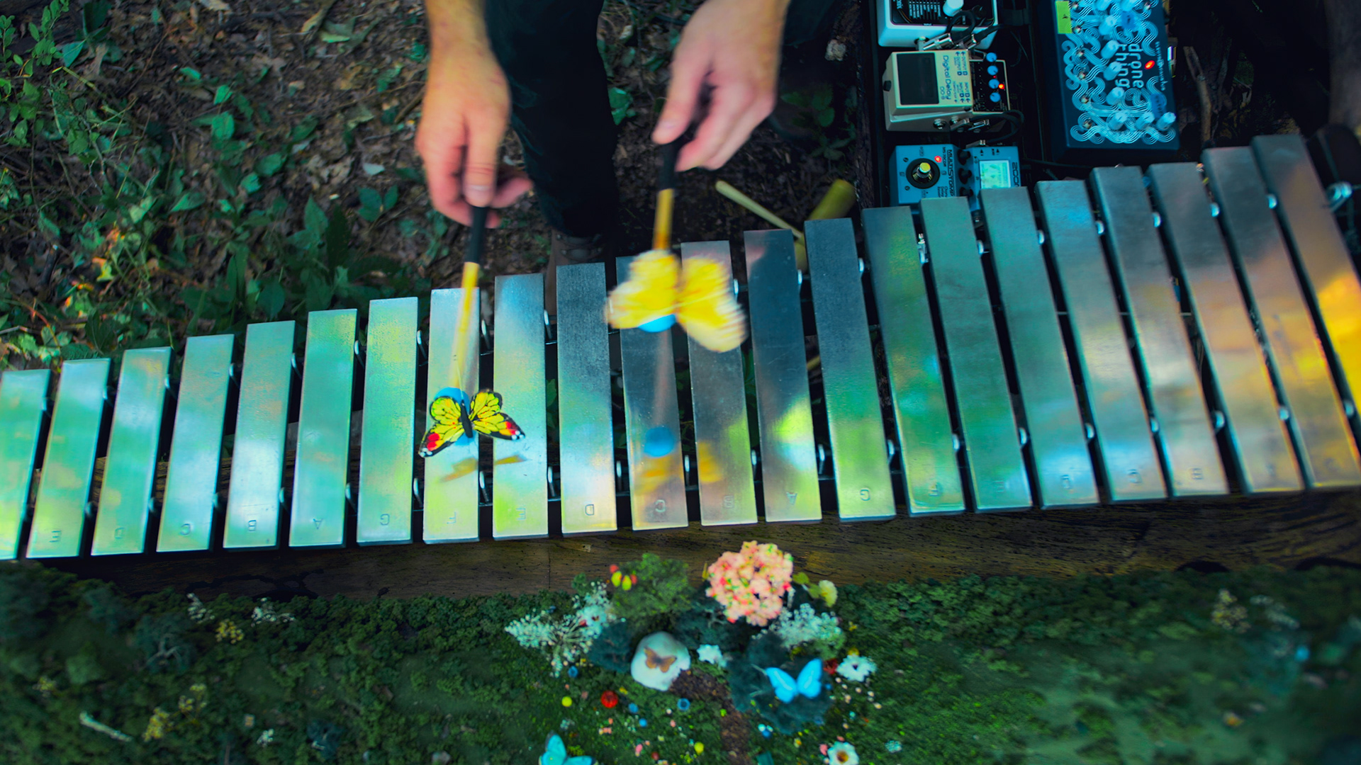 The Magical Butterfly Valley is a customized vibraphone that I restored (I found it in rough shape overall, the resonator pipes and damper mechanism were no longer there) and re-thought as a miniature magical place.